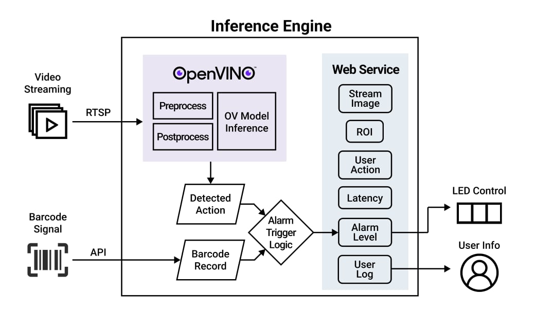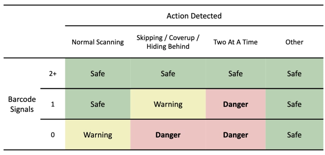 By combining the barcode signals with vision model outputs, we implemented rule-based approach to consider various scenarios. (e.g. passing two items with only one barcode scanned -> "Two-At-A-Time" alert).