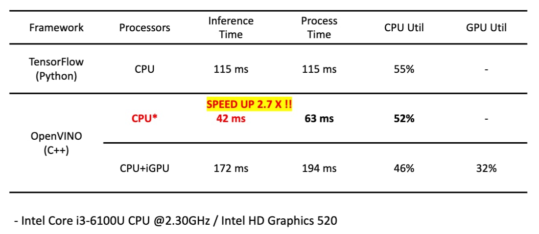 - Optimized heterogeneous AI inference on Intel CPU/iGPU by leveraging OpenVINO/VNNI acceleration; achieved 2.7× faster inference and 2.2× E2E speedup, establishing a new performance standard for a novel CNN architecture